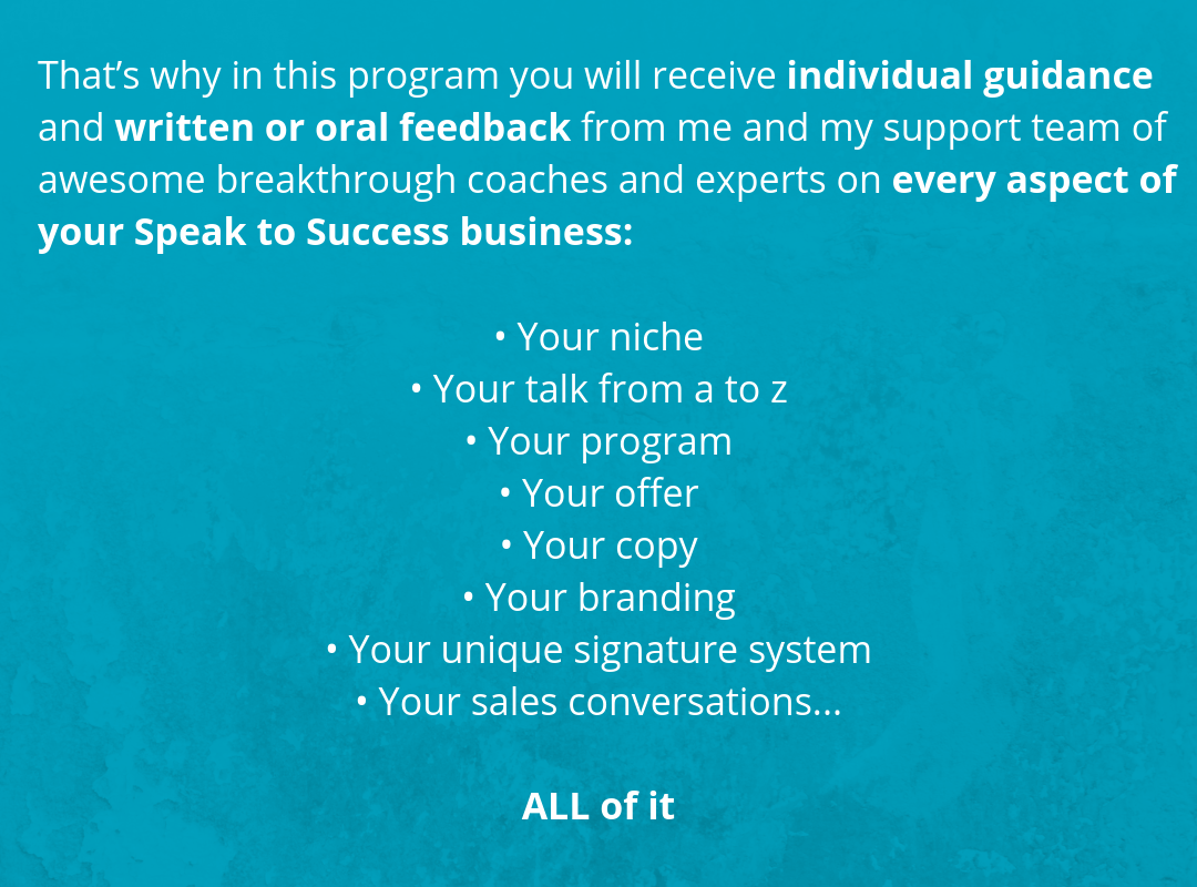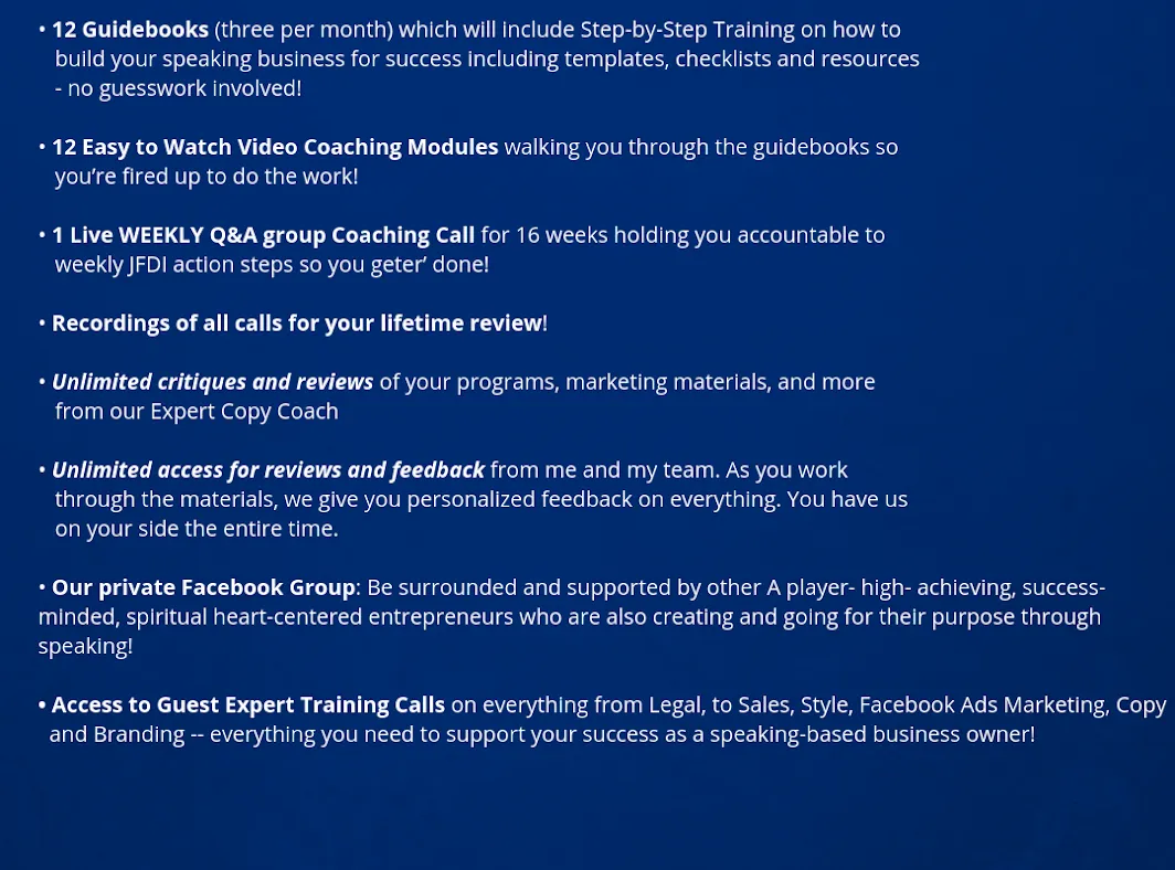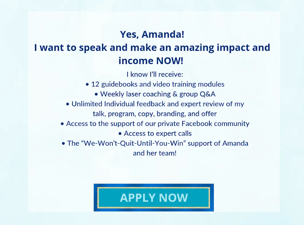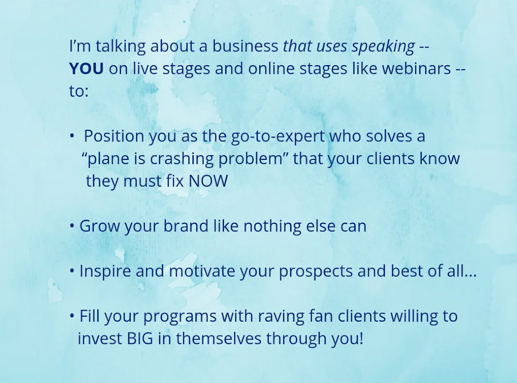 Have a repeatable system that has you signing up at least 3-5 new clients every time you speak (we’ll teach you how to not only speak but how to position your offer to sell like hot cakes!)