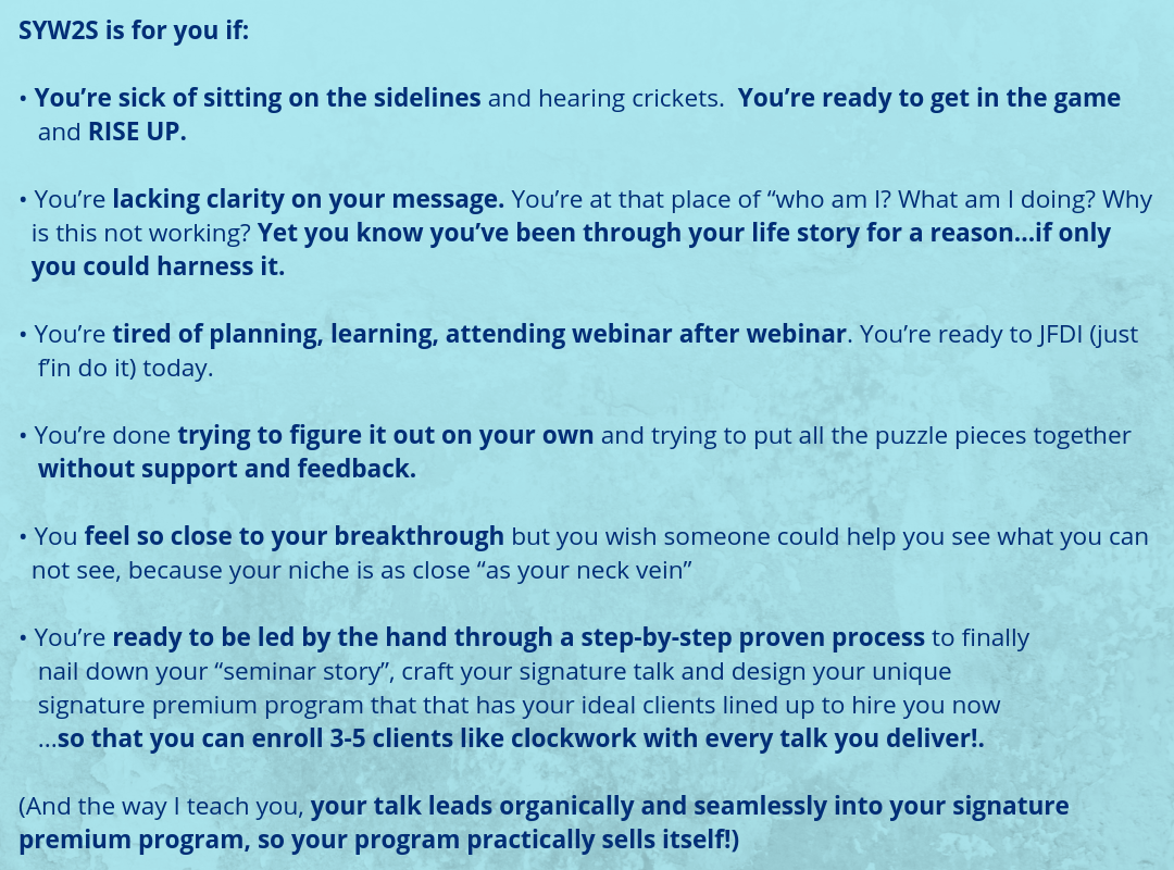 No more “icky salesperson” feeling or fear around sales conversations. You’ll have total confidence making your offer whether it’s from the stage, one-on-one in person or on the phone, because you’ll be coming from a place of deeply serving your clients, not selling them. It’s a beautiful thing! I give you my very own personal roadmap for these transformational conversations, that will have you looking forward to making offers instead of dreading it.
