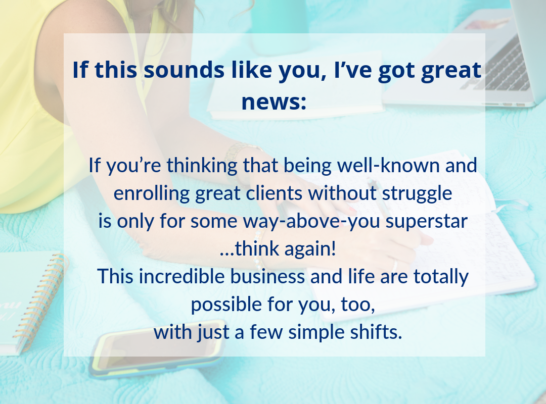 Your story and transformation are also the foundation of a signature premium program that could only come from you. We’ll work through what’s included in yours, and how it’s delivered, based on how you like to work. And we’ll get real and grounded in the true value your clients receive, so that you and they will know in your heart that it’s worth the premium price point we’ll set. Your new prices reflect your new awareness of your value, and allow you to work a lot less while earning a lot more!